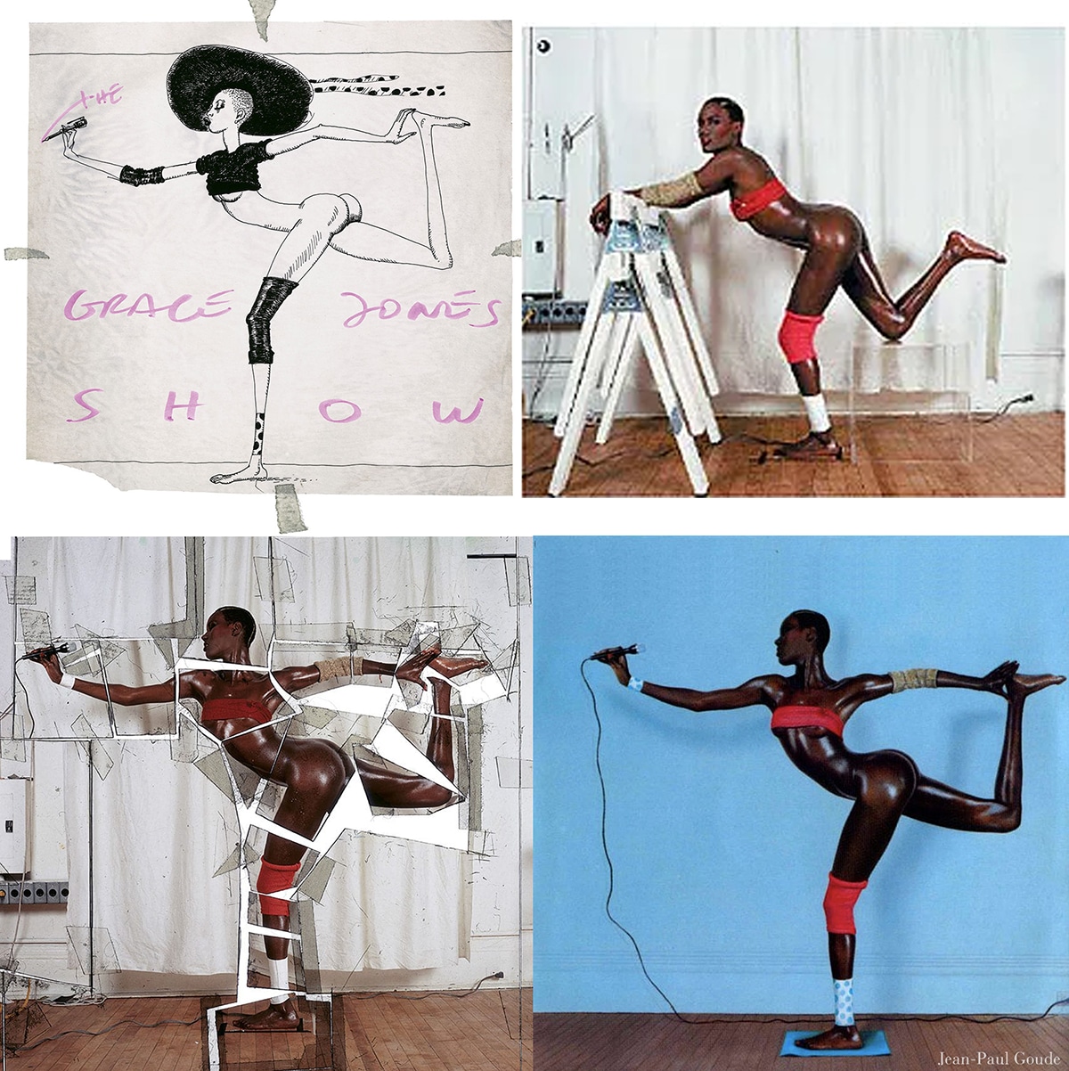 Jean-Paul Goude enhanced features of Grace Jones’ body and put her in a seemingly impossible pose by combining various photographs. He skillfully cut, overlapped, taped and airbrushed gaps between the pieces of film to create a believable illusion. Photomontages were first used in the mid-19th century as a way to create out of the ordinary images. Today, although technically incorrect, we now call this type of picture Photoshopping.